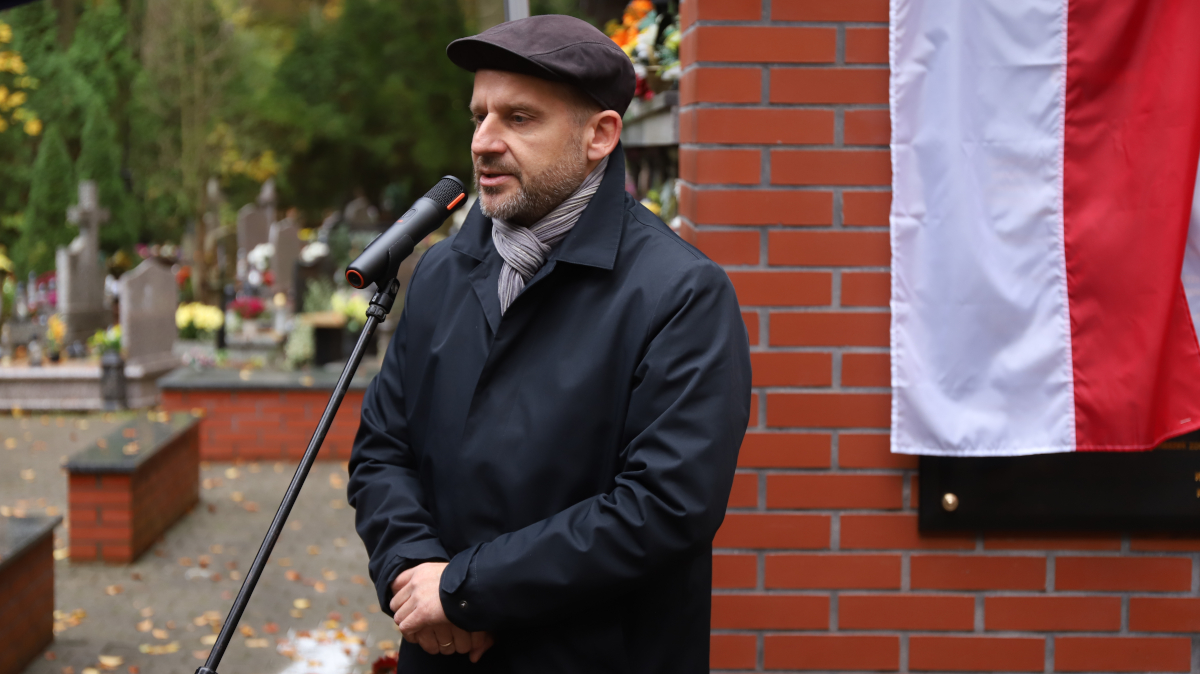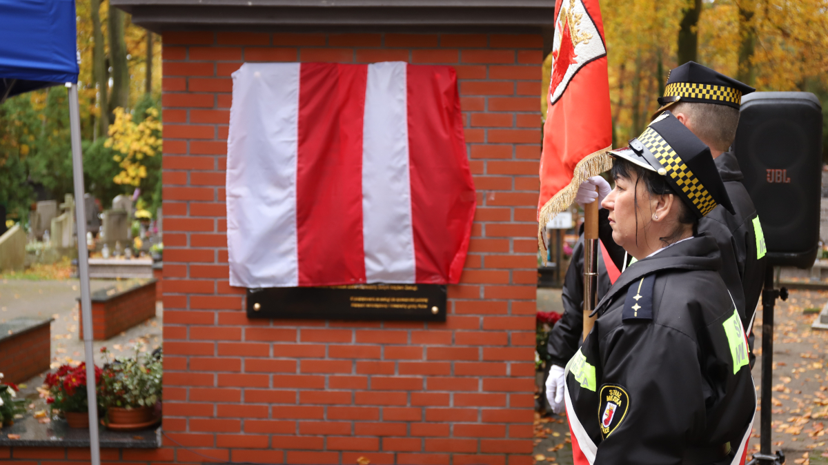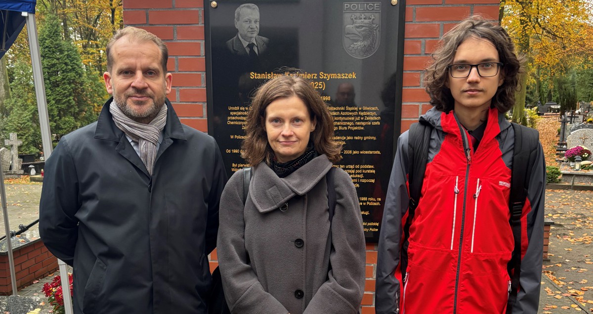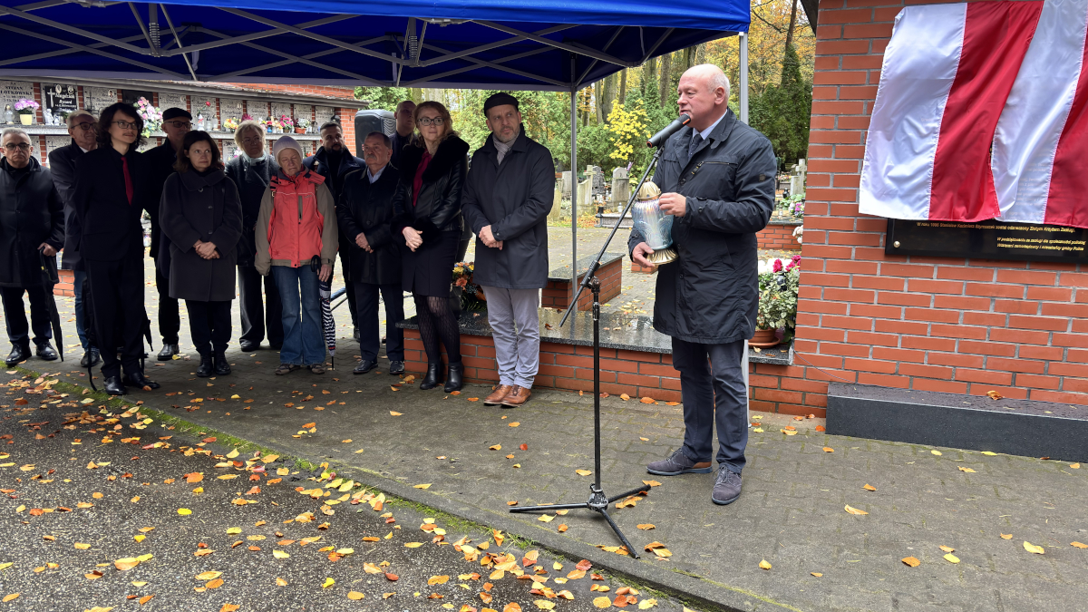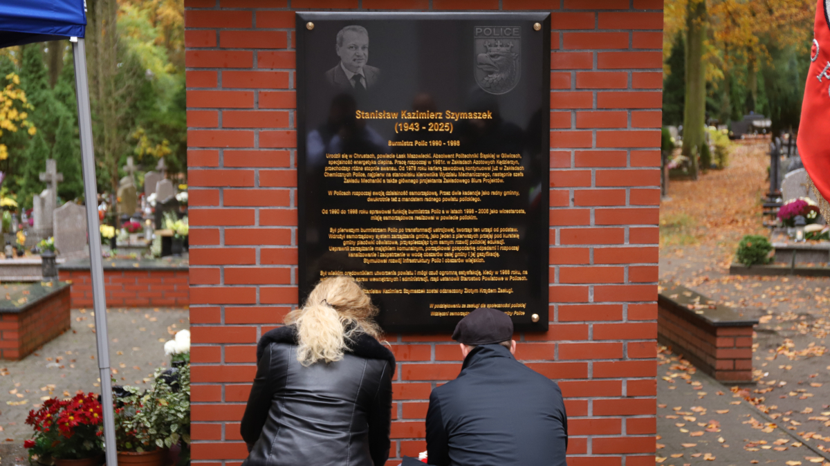 Burmistrz Krystian Kowalewski i Justyna Szymaszek odsłonili tablicę upamiętniającą jej ojca - pierwszego burmistrza naszego miasta po ustrojowej transformacji. Tablica znajduje się na ścianie kolumbarium przy kaplicy polickiego cmentarza.
