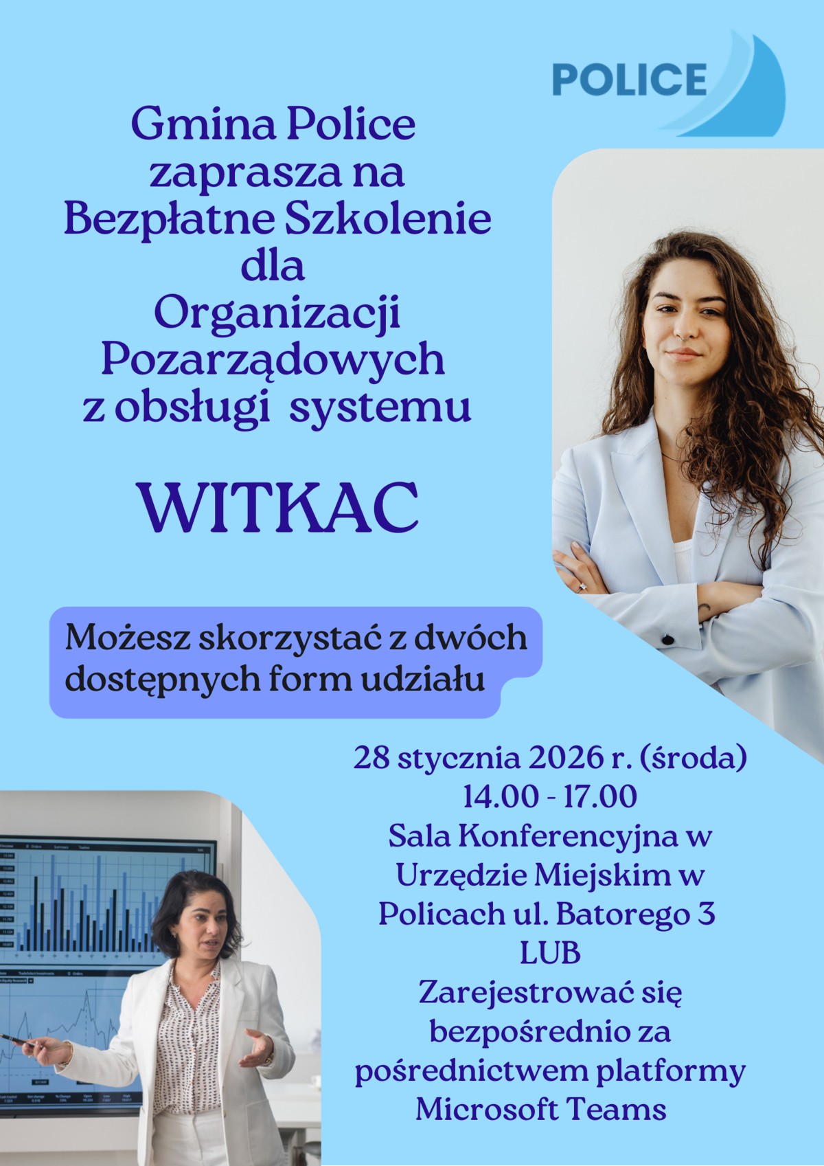 Gmina Police od 2026 roku uruchamia system WITKAC – platformę do ogłaszania konkursów i przyznawania dotacji dla organizacji pozarządowych. W związku z tym zaprasza przedstawicieli NGO na szkolenie z obsługi systemu, które odbędzie się 28 stycznia o godz. 14 w sali konferencyjnej Urzędu Miejskiego w Policach przy ul. Batorego 3. Szkolenie będzie także dostępne online za pośrednictwem platformy Microsoft Teams.