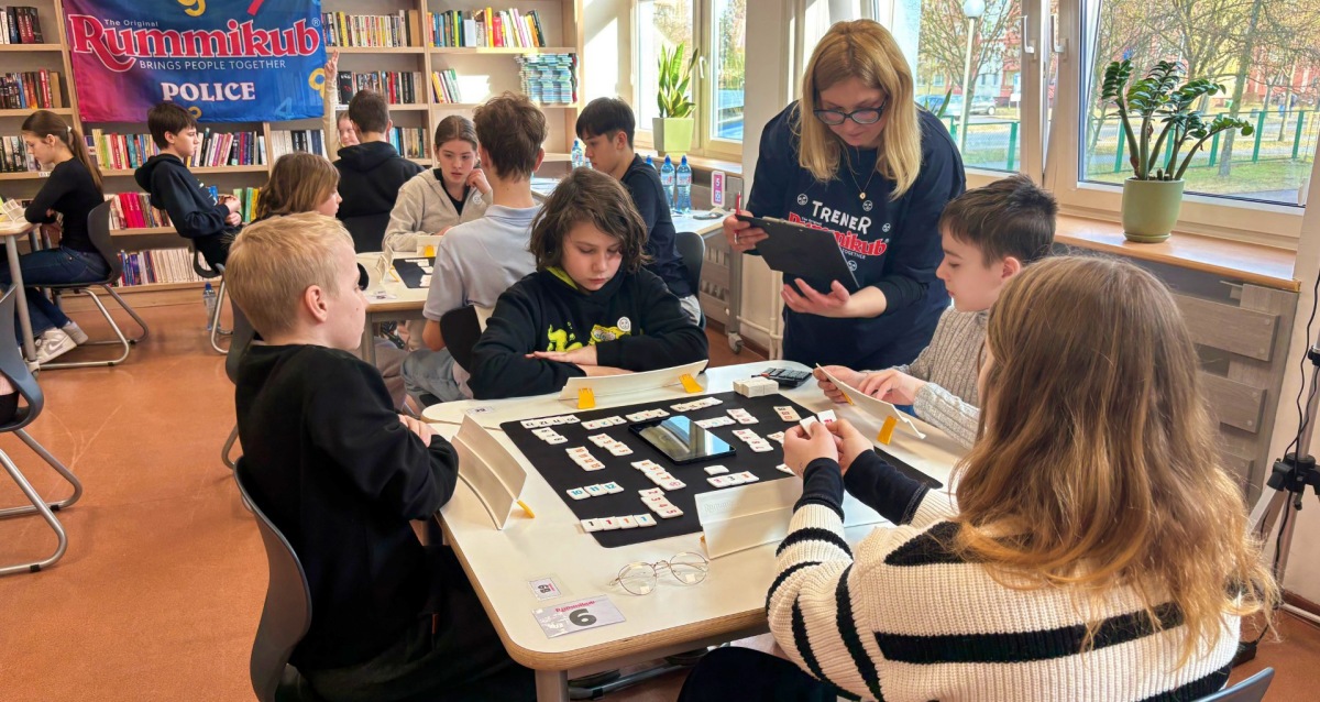 Finał Mistrzostw Szkół Gminy Police Rummikub 2026 odbył się w bibliotece polickiej „Ósemki”. To były pierwsze takie zawody, w których udział wzięli uczniowie szkół z terenu naszej gminy. Jak już wspomnieliśmy, wydarzenie zostało objęte patronatem burmistrza Police.