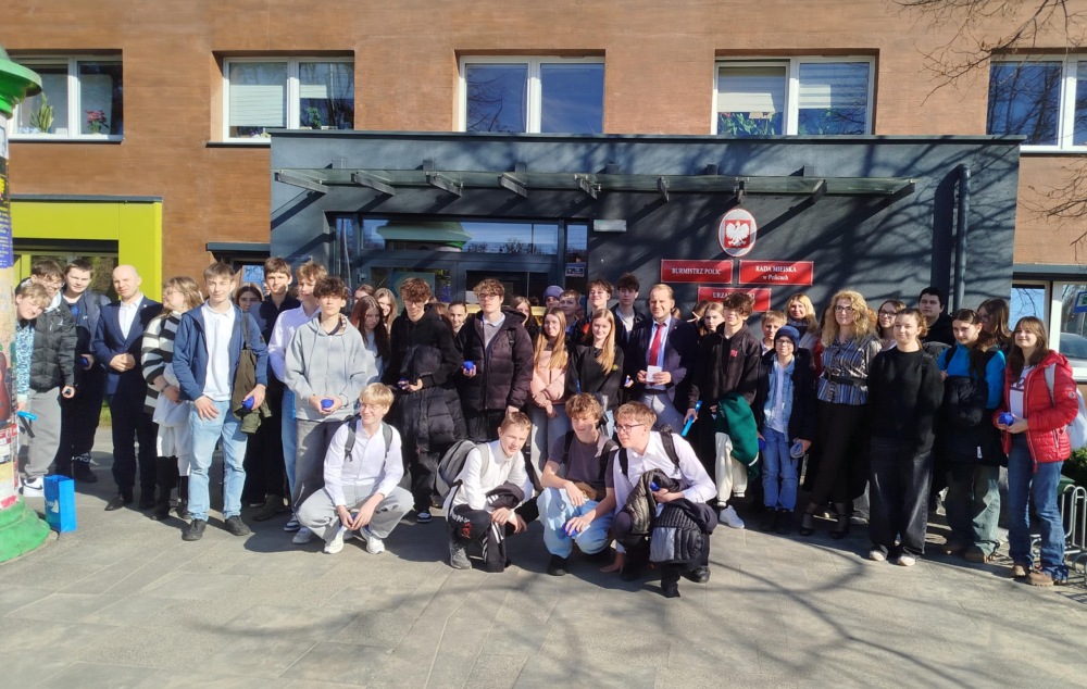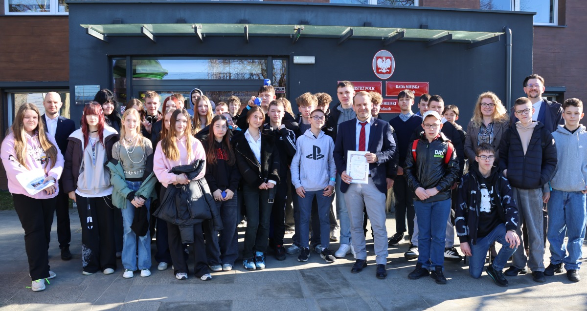 Burmistrz oprowadził uczniów po urzędzie, pokazując część biur poszczególnych wydziałów. Finałem wizyty było wspólne zdjęcie przed głównym wejściem do urzędu.