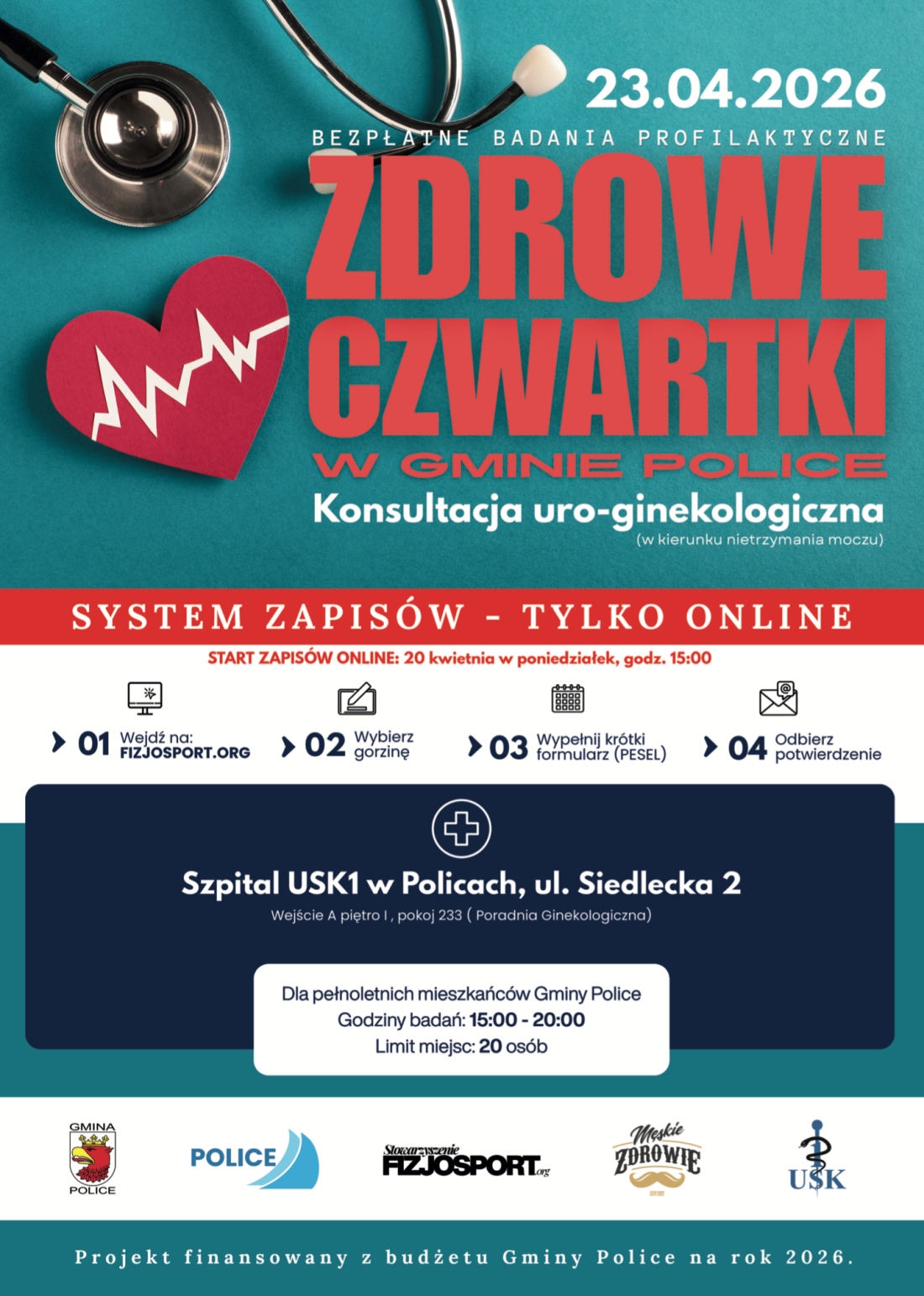 Szanowni Mieszkańcy, zapraszamy do udziału w programie „Zdrowe Czwartki w Gminie Police” – cyklu bezpłatnych działań prozdrowotnych finansowanych z budżetu Gminy Police. To dobra okazja, aby zadbać o swoje zdrowie, skorzystać z konsultacji specjalistycznych oraz poszerzyć wiedzę w zakresie profilaktyki i zdrowego stylu życia.