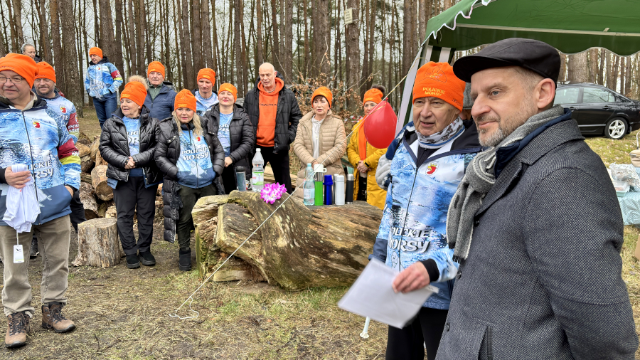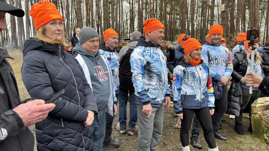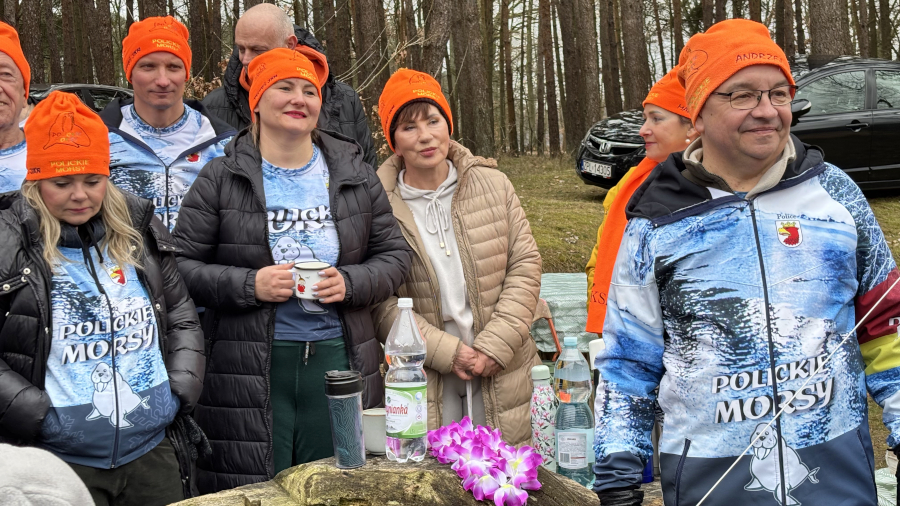 Gratulacje uczestnikom niedzielnego morsowania złożył burmistrz Polic Krystian Kowalewski, który również dał się namówić do wspólnego wejścia do wody.