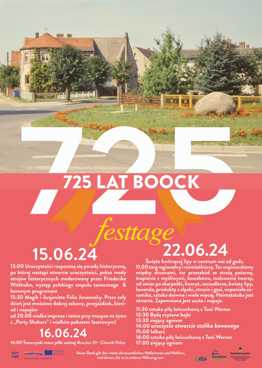 - sobota, 15 czerwca 2024 r. o godz. 13.00 parada historyczna od Neue StraBe 10, po której nastąpi program kulturalny na terenach targowych społeczności Boock, Locknitzer StraBe 7, itp., (o godzinie 14:00 na scenie OpenAir wystąpią "Policzanie"),