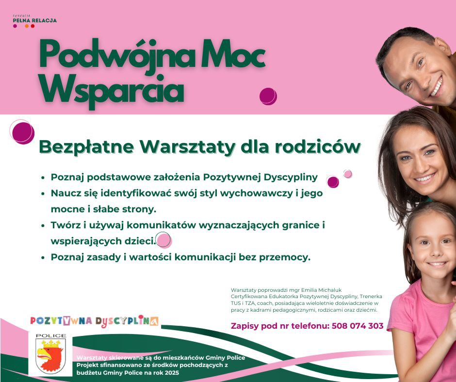 Gmina Police we współpracy z Fundacją Pełna Relacja zaprasza rodziców dzieci w wieku przedszkolnym na bezpłatne warsztaty pt. „Podwójna Moc Wsparcia”.