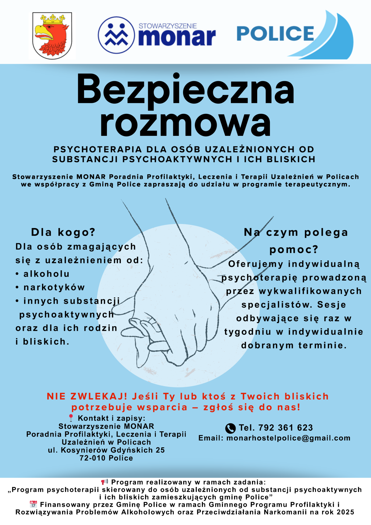 „Program psychoterapii skierowany do osób uzależnionych od substancji psychoaktywnych i ich bliskich zamieszkujących Gminę Police”.